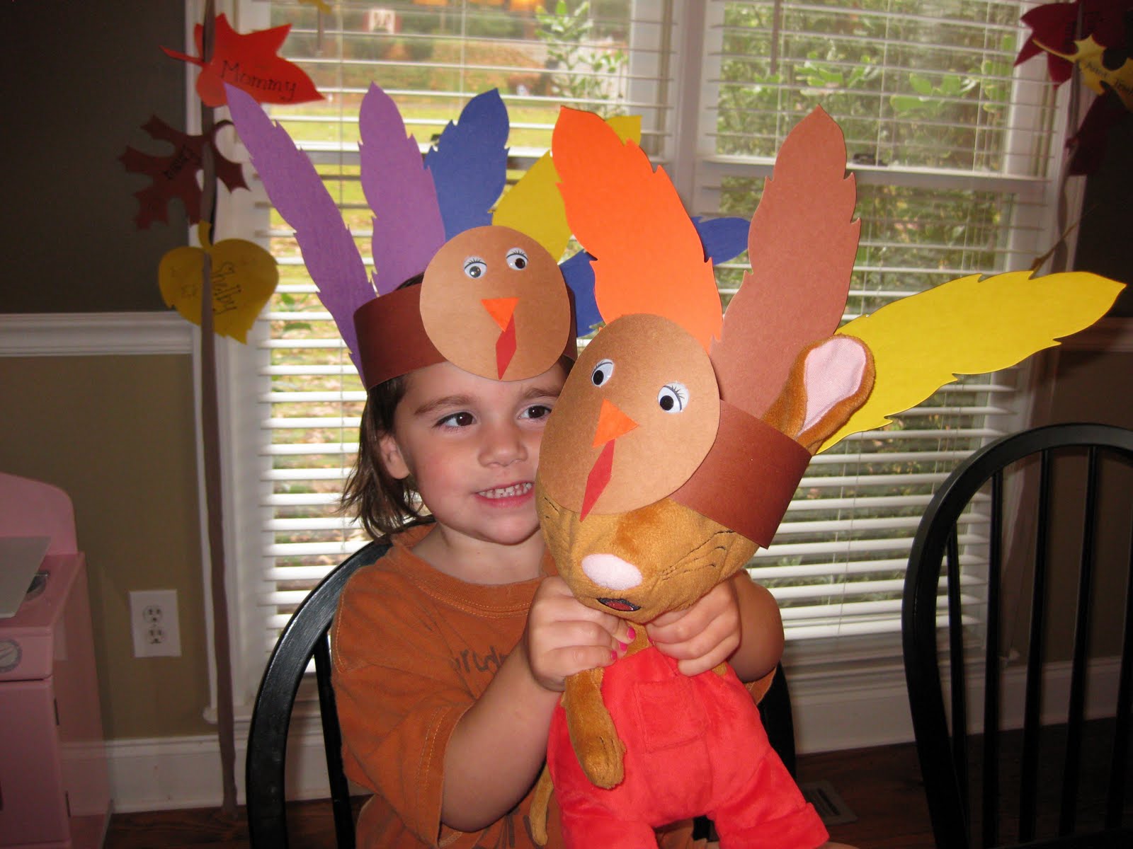 After we'd finished all the big people headbands, Katie Anne realized that we'd forgotten one crucial person's headband ... Peach the Mouse! So, of course, we went back and made Peach a tiny turkey headband.